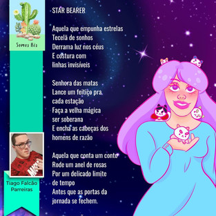 #PraCegoVer #PraTodosVerem: Ilustração. Fundo do slide retrata um céu estrelado. À esquerda um texto em inglês escrito em branco. No canto superior direito um retângulo vermelho escrito "English" em branco. Mais abaixo aparece um desenho inspirado na série "Bee and PuppyCat". A persongem está sorrindo, tem a pele branca com as bochechas rosadas, cabelos longos na cor lilás, olhos lilás e uma boca rosa. Ela usa um vestido azul turquesa e com a mão direita segura um bichinho de estimação chamado "puppycat", uma criatura híbrida de cão-gato com corpo rosa, cabeça branca, orelhas e olhos rosa. Há outros quatro "puppycats" brancos que rodeiam a personagem, mas só é possível ver a parte do corpo deles. O primeiro está apoiado no ombro direito, tem orelhas e olhos pretos, o corpo vermelho. Do lado esquerdo há outro com orelhas e olhos verdes. O terceiro aparece atrás da cabeça, possui orelhas e olhos rosa do lado esquerdo e outro com orelhas e olhos azuis do lado direito. No segundo slide, aparece à esquerda a versão em português do texto, também escrito em branco. No canto superior direito um retângulo verde escrito "Português" em preto. O fundo é o mesmo do slide anterior, com céu estrelado e a arte inspirada em "Bee and PuppyCat". Moldura traz uma faixa vertical verde água com o símbolo da SPN, a foto em plano americano do artista Tiago Falcão Parreiras e o nome dele em preto abaixo da imagem. Ele tem a pele branca, usa óculos de grau e uma camiseta vermelha escrito “Marvel”. Tiago está fazendo o símbolo do rock and roll com a mão direita. Ilustração no terceiro slide. Fundo roxo com bolinhas amarelas. Desta vez a figura da personagem rodeada de "puppycats" está no centro. Fim da descrição. (Legenda acessível por Bia Palumbo)